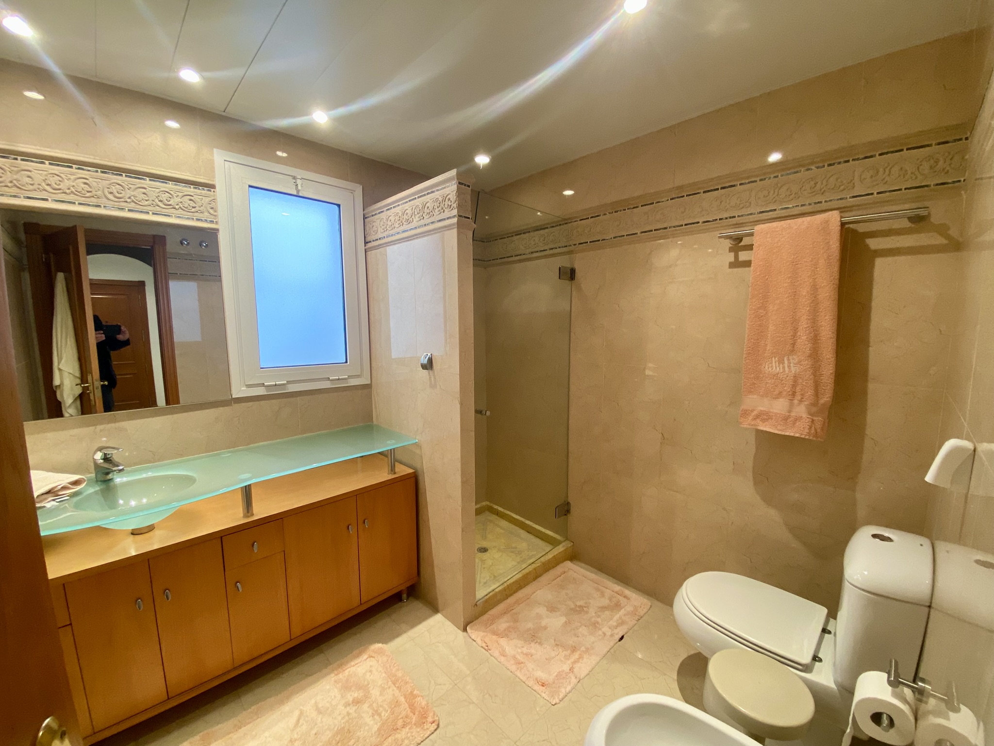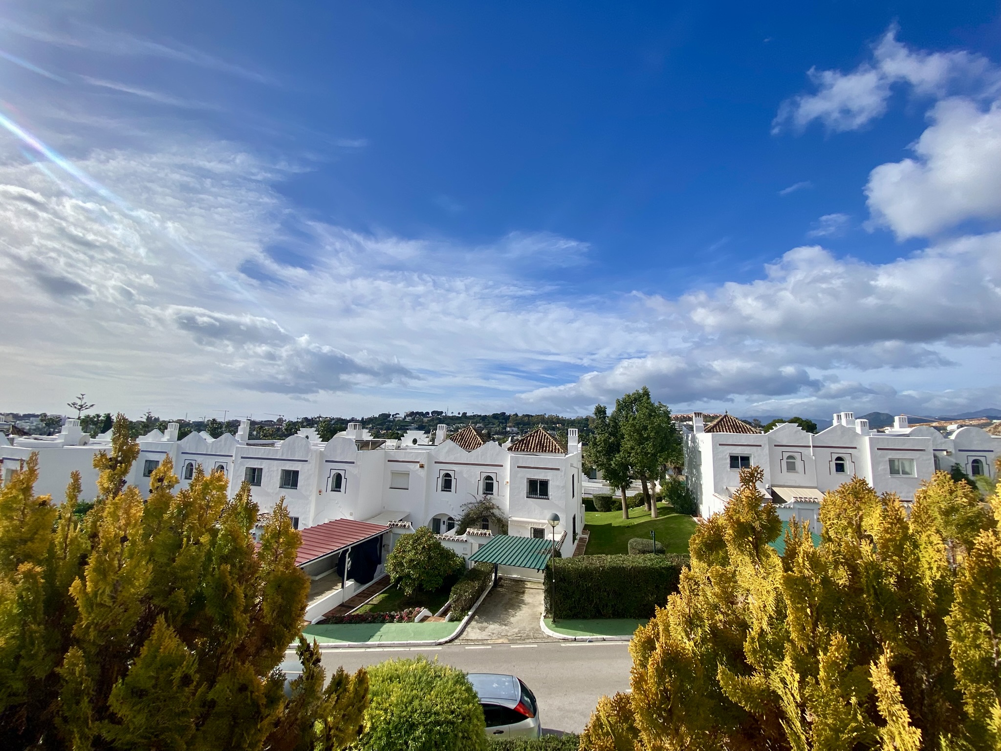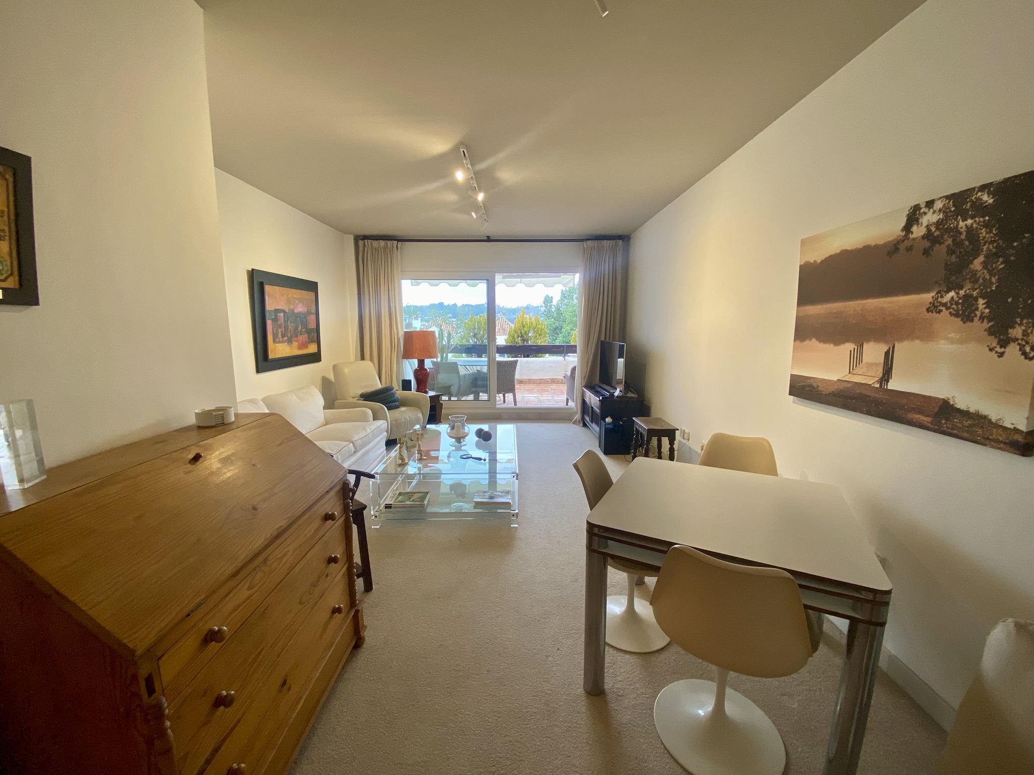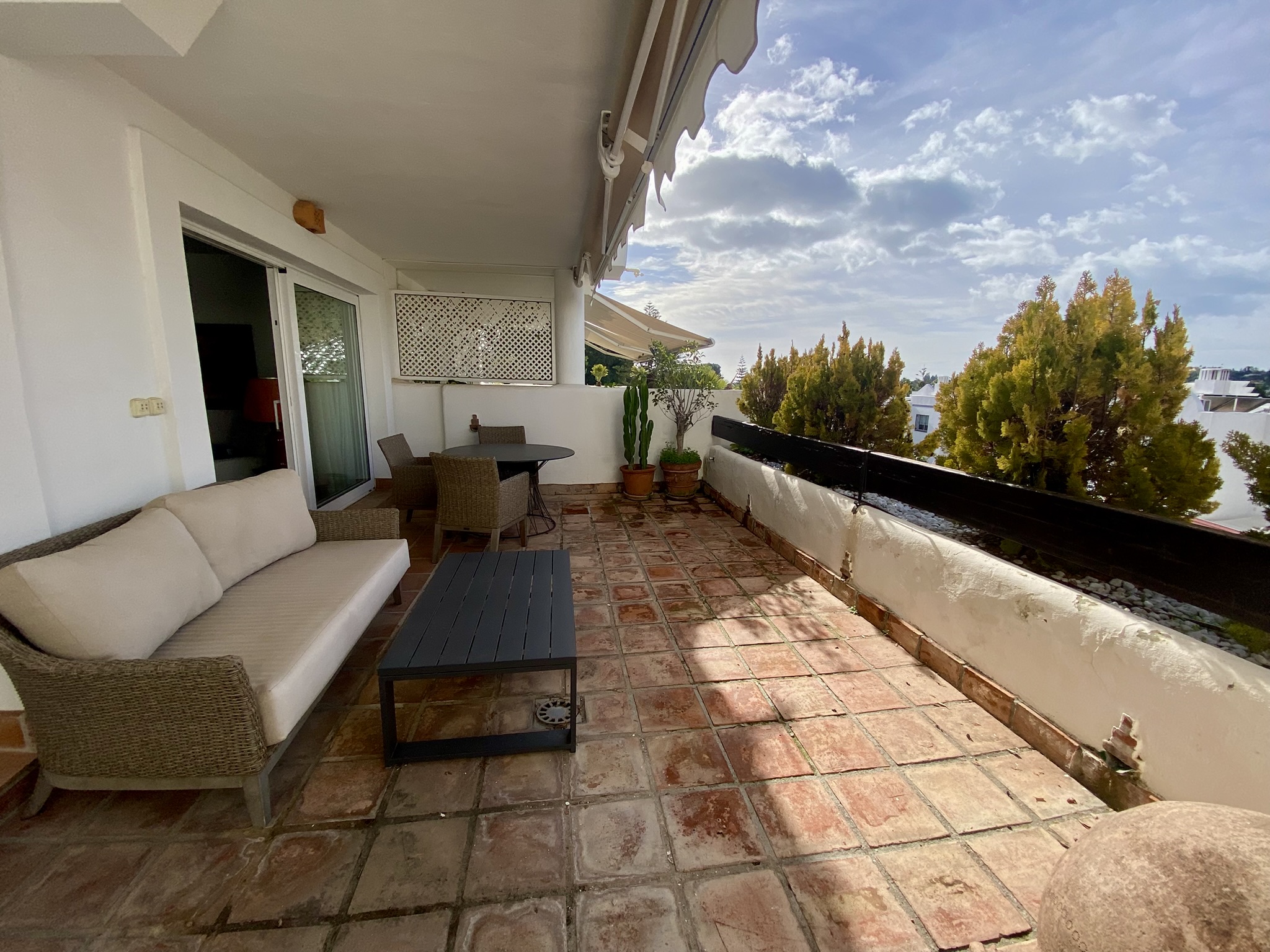 First floor apartment built in 2005 located in the golf valley of Nueva Andalucia only a walk away from the clubhouse of Aloha Golf and a short drive from many restaurants, padel tennis and tennis club, a supermarket or the beaches around Puerto Banus. Contemporary in style, this apartment enjoys marble floors throughout, with carpet in the living room, and is fitted with Air Conditioning hot & cold, electric blinds in the bedrooms and electric sun blinds on the terrace. This southwest facing apartment enjoys views to the general surroundings and offers 2 bedrooms, 1 en suite bathroom with Jacuzzi bath and ventilator, 1 independent shower room, living room with access to the large terrace, fully fitted kitchen with back terrace and laundry, as well as 1 parking space and 1 storage room in the communal garage. The community is gated and offers an adult and children swimming pool. Good rental potential with this central location and the proximity of the golf courses of Aloha, Las Brisas, Los Naranjos and Dama de Noche. The apartment is offered in impeccable condition but also offers potential for refurbishment. The furniture is not included but optional.