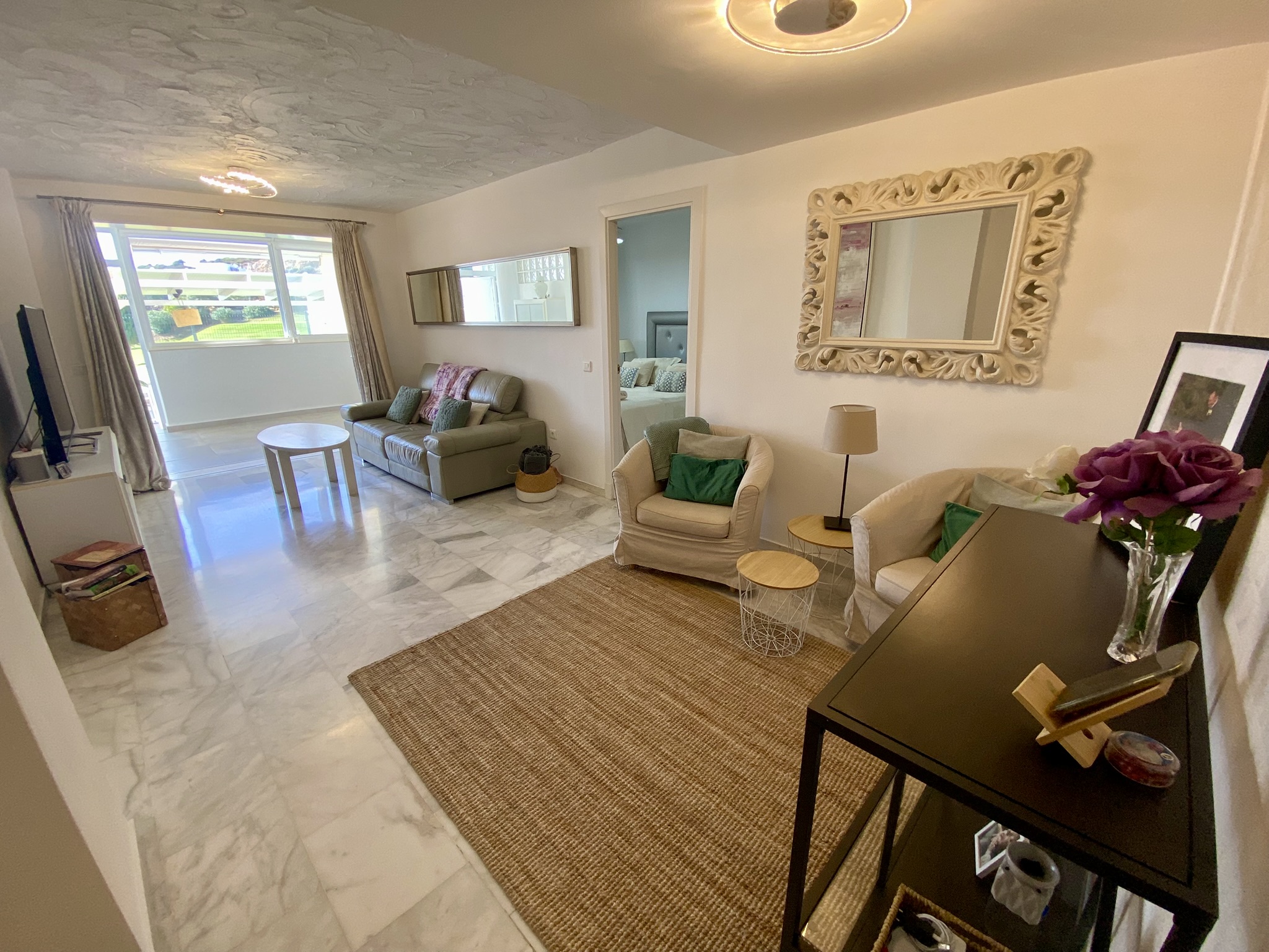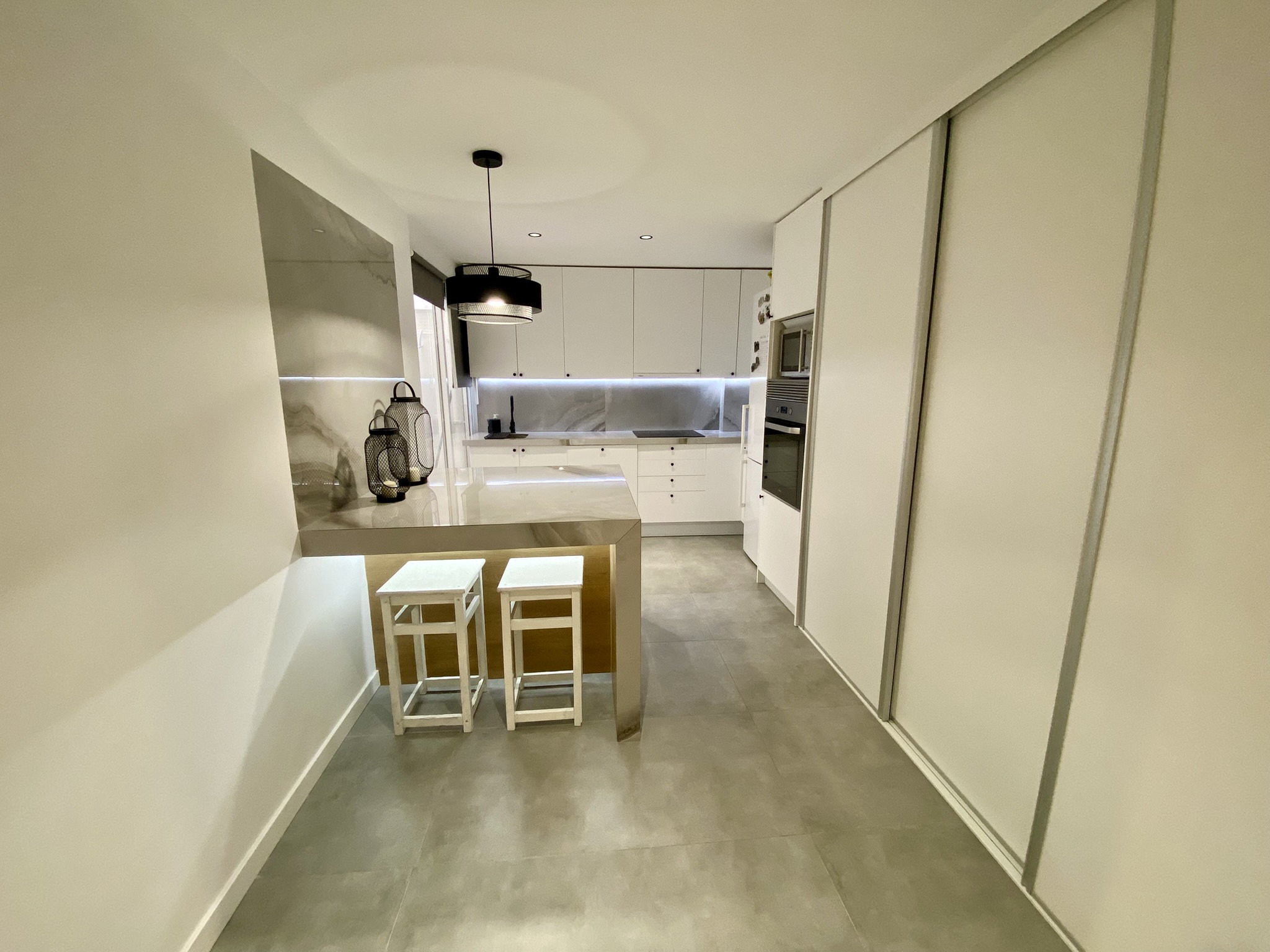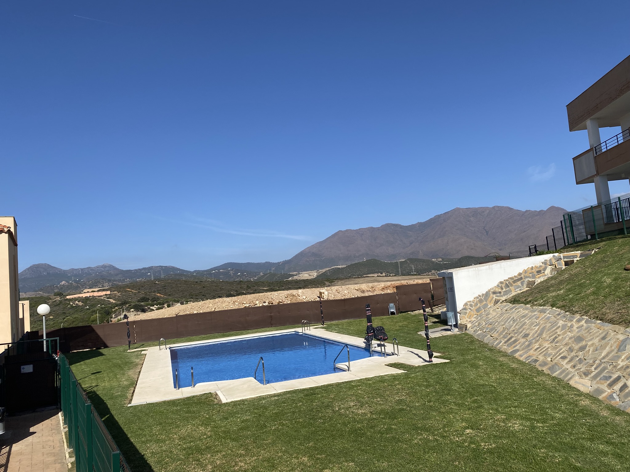 Recently refurbished front line golf apartment situated on the golf course of Doña Julia, in the municipality of Casares, only 3 km away from San Luis de Sabinillas and 10 km from the centre of Estepona. This southwest oriented ground floor offers uninterrupted views over the golf course reaching all the way to the Mediterranean and the coast of Africa from it’s 65 m2 terrace. The apartment offers 2 double bedrooms, 1 single bedroom, 2 shower rooms, 1 living room, 1 dining room, modern fully fitted kitchen with island and patio, as well as a utility room with guest toilet under the covered terrace. Tiled in a combination of marble and ceramic tiles, this apartment enjoys air conditioning hot & cold throughout. The master bedroom is en-suite. The beautiful terrace has a wooden pergola partially covering and is fitted with an Argentinian barbecue and al-fresco dining area for hot summer nights. Finally, the property includes a parking space in the communal garage. The community is gated, features a swimming pool, and the macro-community offers a security barrier with guard. A good opportunity to purchase this spacious apartment in an upcoming area at a competitive price.
