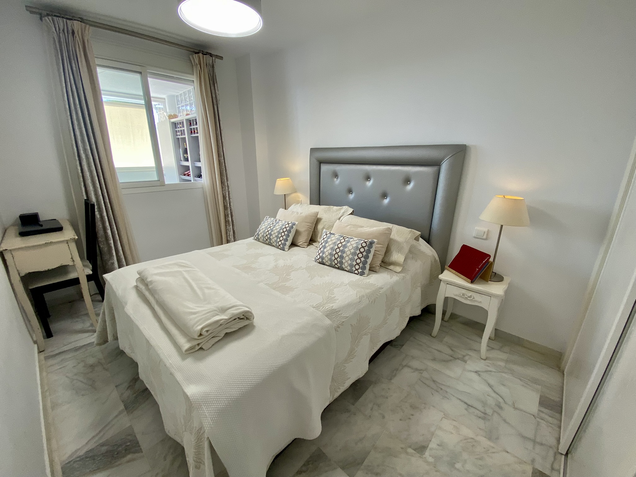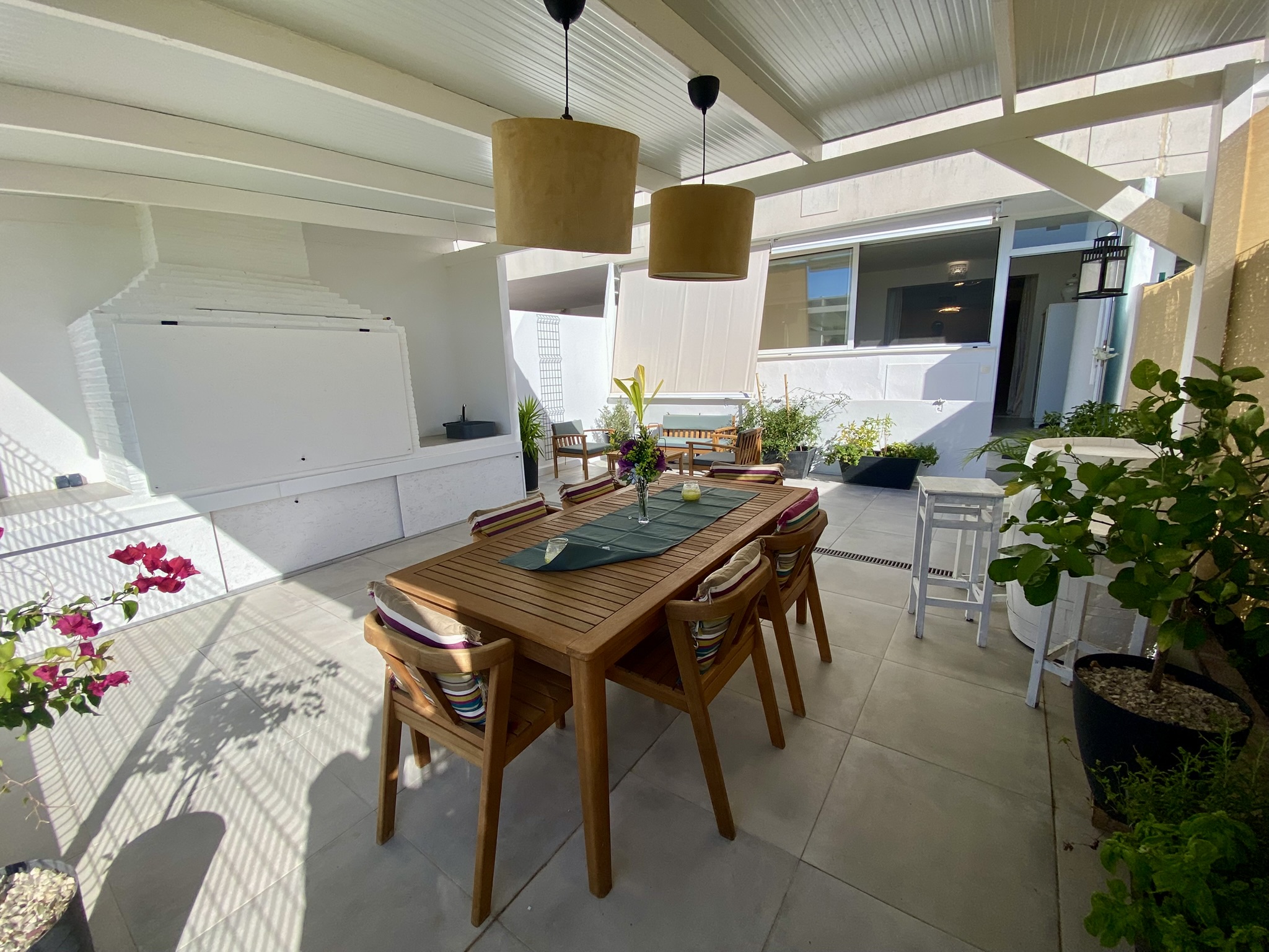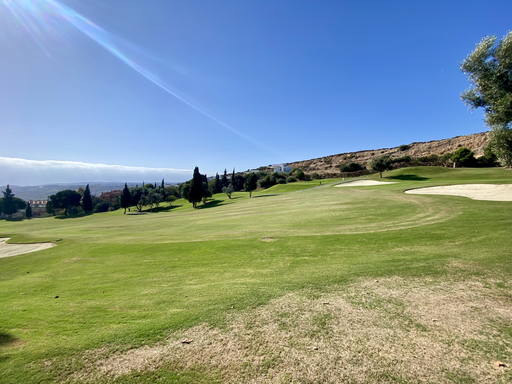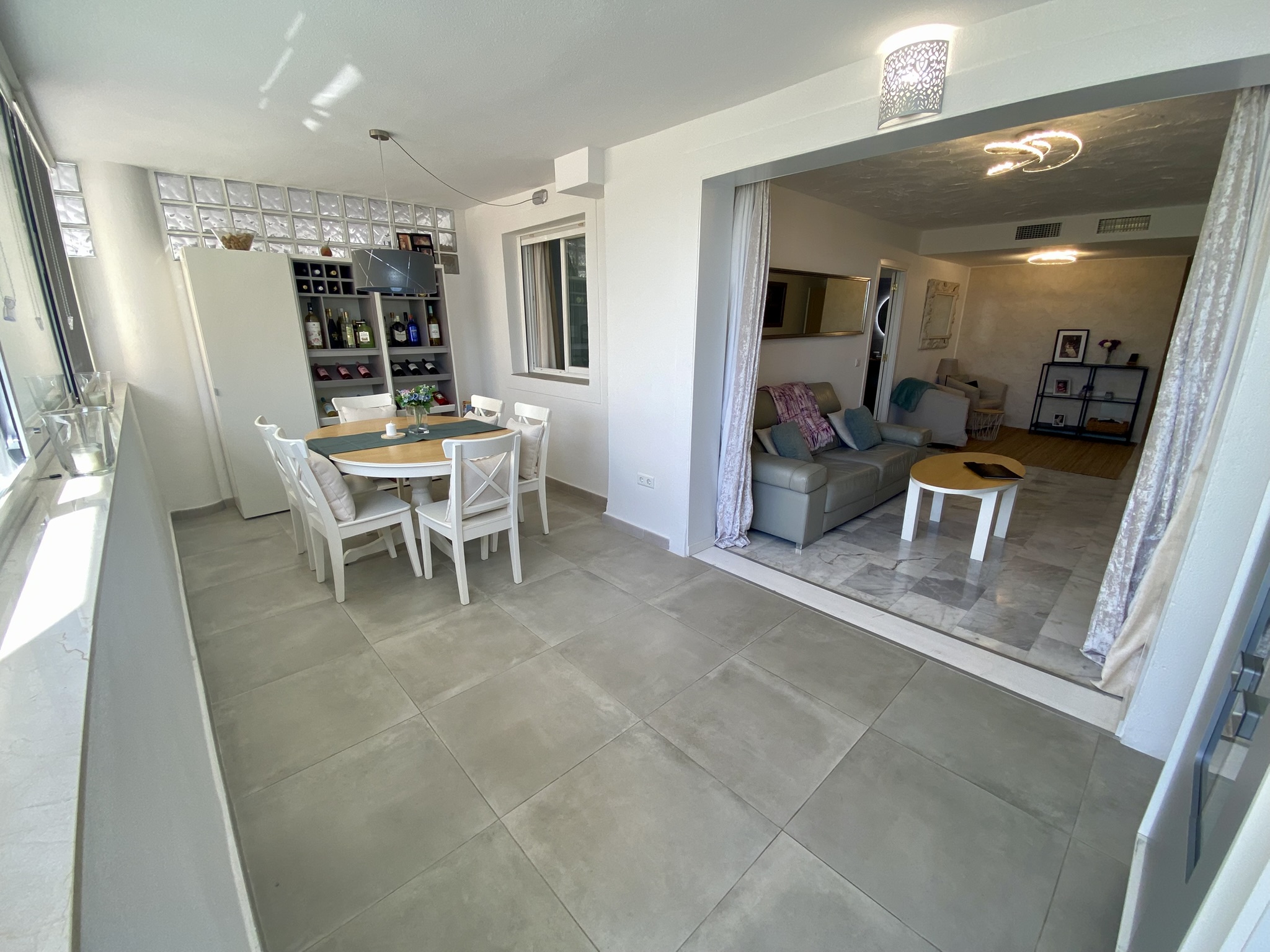 Recently refurbished front line golf apartment situated on the golf course of Doña Julia, in the municipality of Casares, only 3 km away from San Luis de Sabinillas and 10 km from the centre of Estepona. This southwest oriented ground floor offers uninterrupted views over the golf course reaching all the way to the Mediterranean and the coast of Africa from it’s 65 m2 terrace. The apartment offers 2 double bedrooms, 1 single bedroom, 2 shower rooms, 1 living room, 1 dining room, modern fully fitted kitchen with island and patio, as well as a utility room with guest toilet under the covered terrace. Tiled in a combination of marble and ceramic tiles, this apartment enjoys air conditioning hot & cold throughout. The master bedroom is en-suite. The beautiful terrace has a wooden pergola partially covering and is fitted with an Argentinian barbecue and al-fresco dining area for hot summer nights. Finally, the property includes a parking space in the communal garage. The community is gated, features a swimming pool, and the macro-community offers a security barrier with guard. A good opportunity to purchase this spacious apartment in an upcoming area at a competitive price.