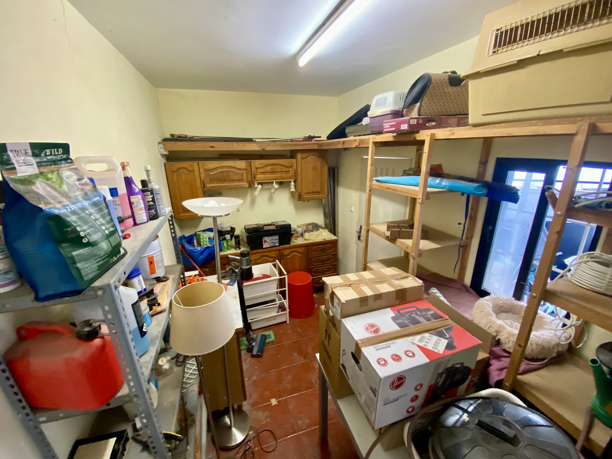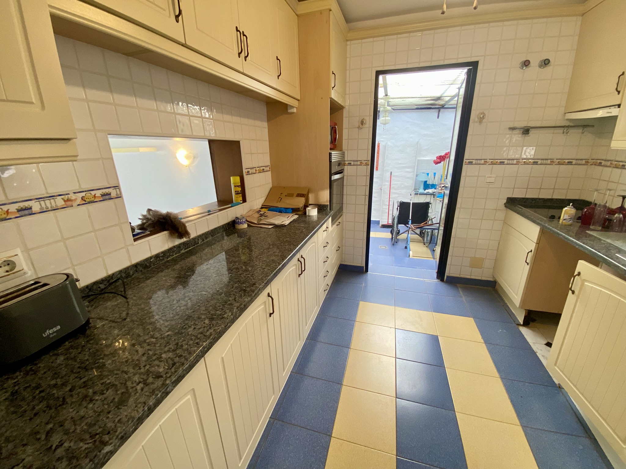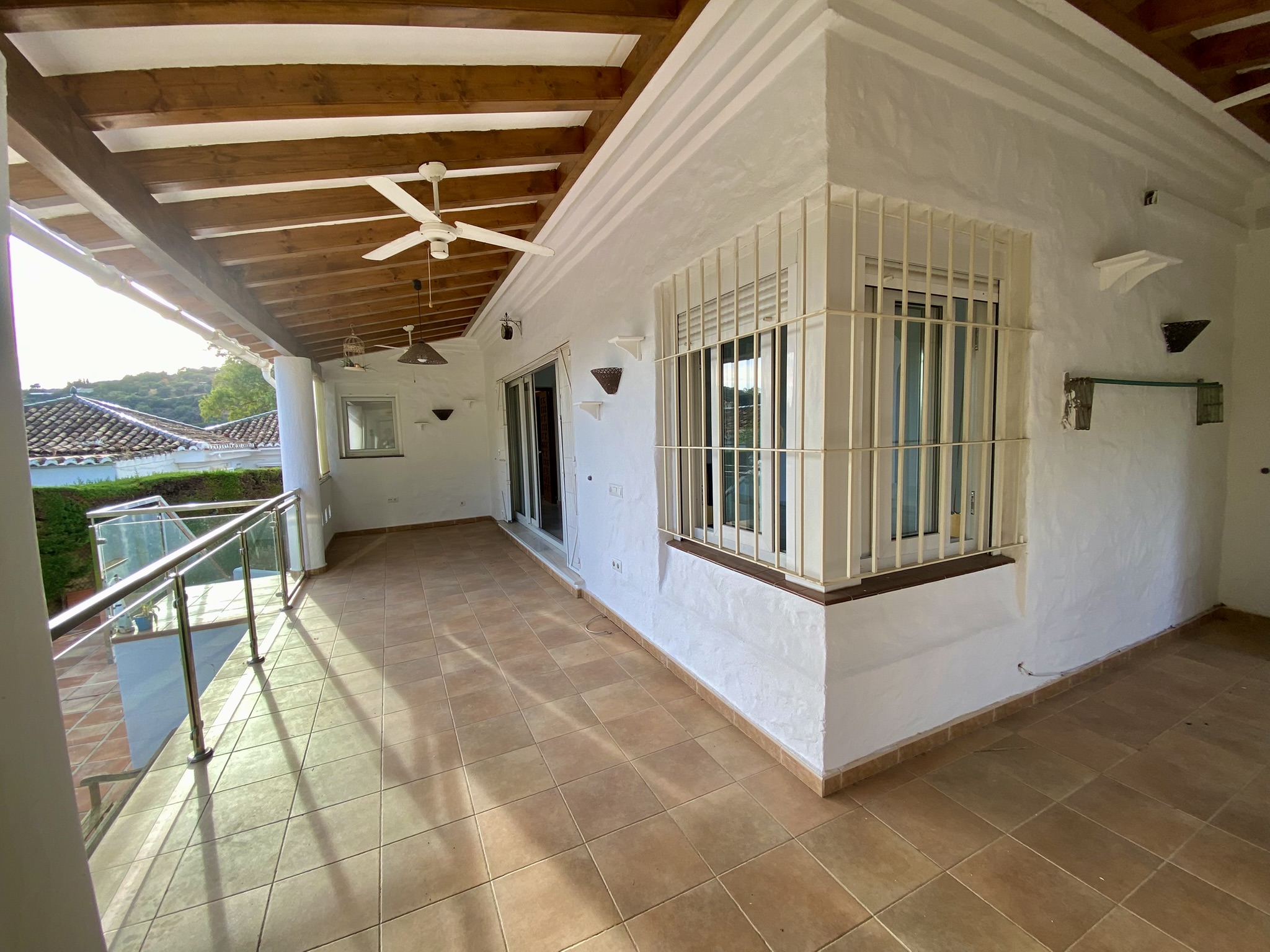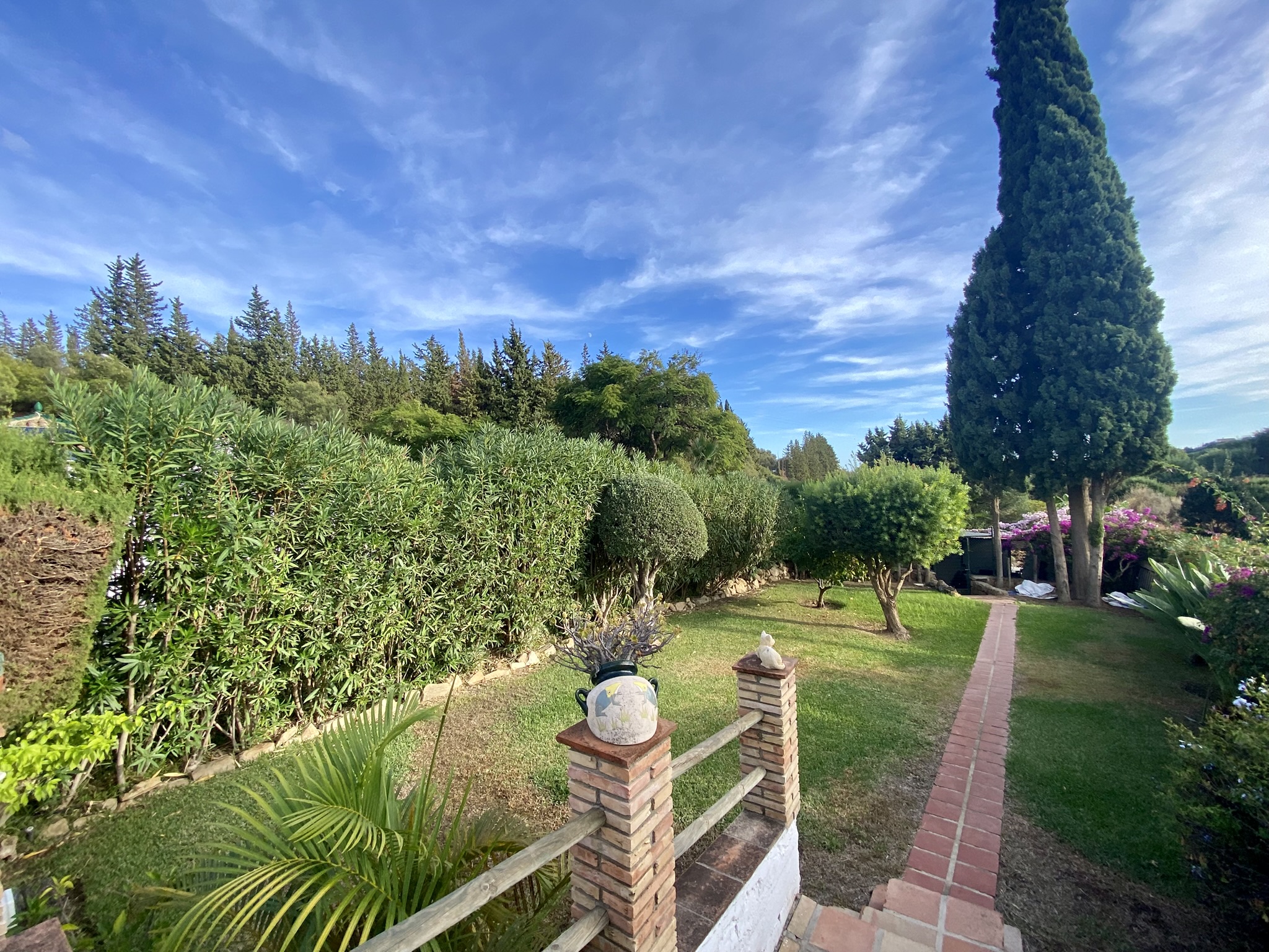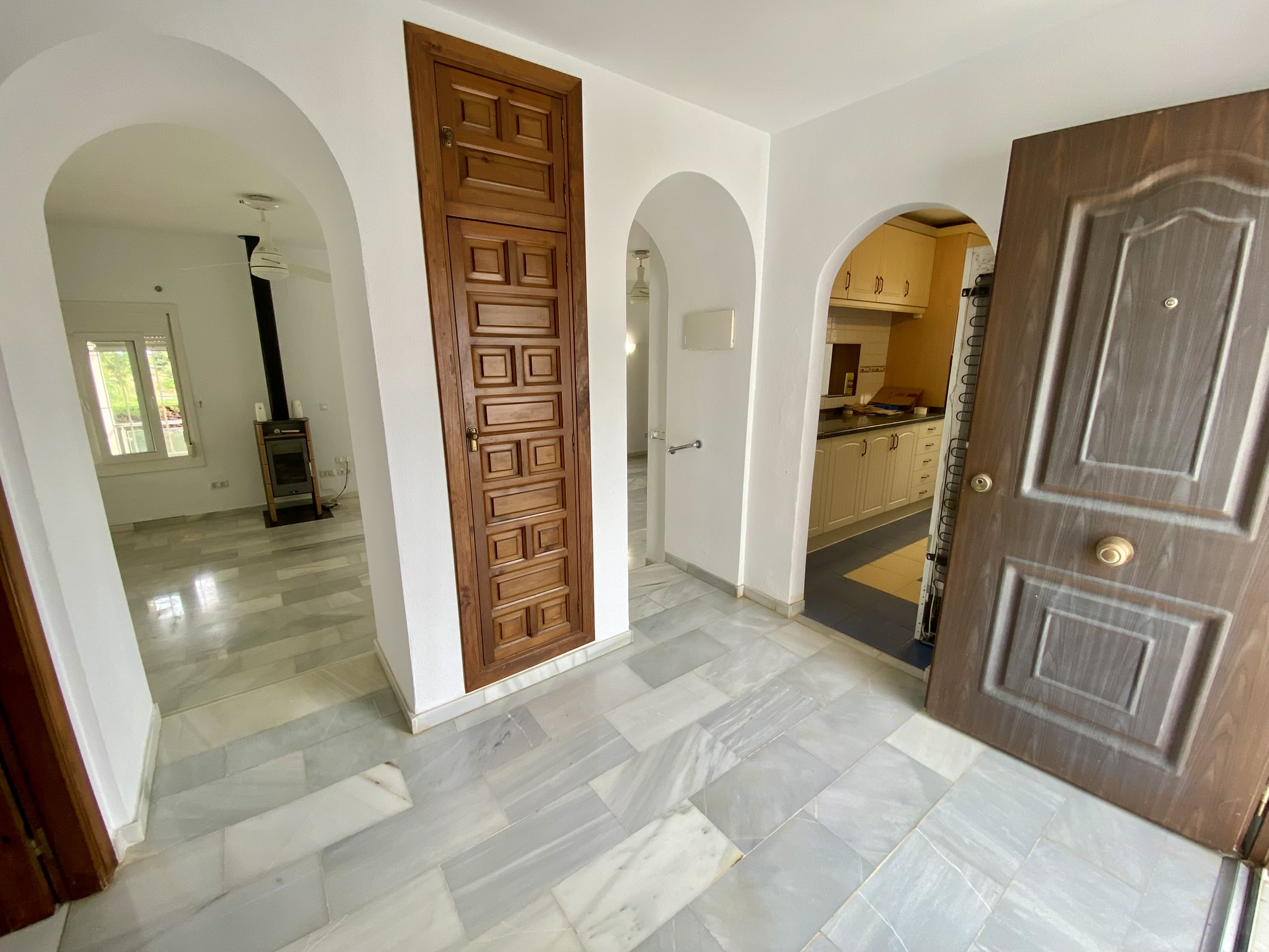 A very well-maintained classical Andalusian villa, located just 4 kilometres from the beach in a quiet residential area east of Estepona town, known as Forest Hills near the El Padrón River. Built in 1985, the property offers excellent renovation potential for future owners. The villa is arranged on one level and features an attractive entrance patio with a fountain leading to an entrance hall, three bedrooms, two bathrooms, a guest cloakroom, a living room with a pellet fireplace, and a fitted kitchen with adjacent laundry area. Additional spaces include a covered terrace with a dining area, a covered patio, a storage room, a garage for one car, and three built-in cupboards. The mainly southwest-facing villa enjoys a private garden with swimming pool, as well as a covered parking space in a communal area. Marble flooring runs throughout the house, with terracotta tiles on the terraces. The property is equipped with manual blinds in the bedrooms, an electric blind in the living room, and split air-conditioning units. A tennis and padel club with restaurant is located just 1 kilometre away, while an Aldi supermarket and BP petrol station are situated on the way to the beach. Estepona town centre is only a 7-minute drive, Puerto Banús is 20 minutes away, and Málaga Airport can be reached in under an hour. The villa enjoys pleasant views of the natural surroundings and its own garden, making it an excellent project for conversion into a charming holiday home or a comfortable permanent residence.