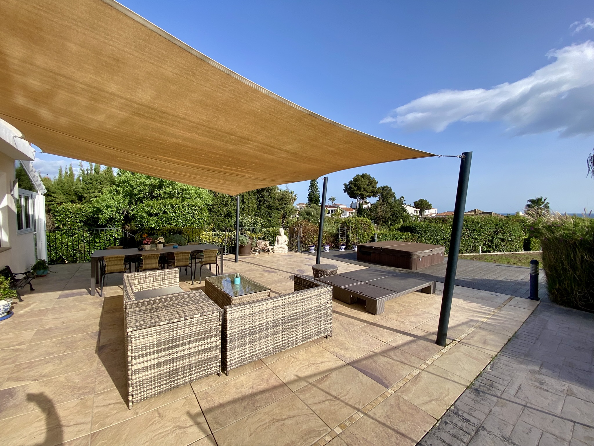Villa andalouse contemporaine située juste à l’est de Estepona, à seulement 3 km de Beso Beach Estepona, Sublime Beach, Camuri, du supermarché Aldi et de la station-service BP du quartier El Padrón. Construite en 1997 et rénovée en 2024, cette propriété orientée plein sud comprend une villa principale avec de magnifiques vues sur la mer ainsi qu’une maison d’invités. La villa principale offre 4 chambres, 3 salles de bains, une nouvelle cuisine ouverte entièrement équipée avec salle à manger et salon, une véranda, une buanderie, une toilette d’invité et une terrasse couverte avec accès à la piscine. La chambre principale, située à l’étage supérieur, dispose d’une salle de bains en suite et d’une terrasse privée avec des vues spectaculaires sur les environs et la mer Méditerranée, jusqu’à Gibraltar. La propriété comprend également une maison d’invités composée d’une cuisine entièrement équipée avec un petit salon, de 2 chambres et de 2 salles de bains, ainsi qu’un parking extérieur pour 2 voitures. La maison principale est équipée de la climatisation chaud et froid, de volets électriques aux fenêtres et de stores extérieurs, le tout relié à des panneaux solaires, tandis que la maison d’invités dispose d’unités de climatisation de type split. Enfin, la propriété dispose d’un jardin mature, d’un bel espace piscine, de grandes terrasses et d’un jacuzzi. Une excellente maison pour y vivre toute l’année ou comme investissement avec potentiel locatif, située dans un quartier résidentiel paisible où vous pourrez profiter du calme tout en étant à seulement quelques minutes du centre-ville ou de la nouvelle promenade.